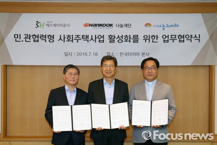 (서울=포커스뉴스) 한국타이어는 SH공사, 사단법인 나눔과미래와 사회주택 공급활성화와 주거약자 지원을 목표로 '동그라미 사회주택기금'의 운영·관리를 위한 업무협약(MOU)식을 가졌다고 18일 밝혔다.