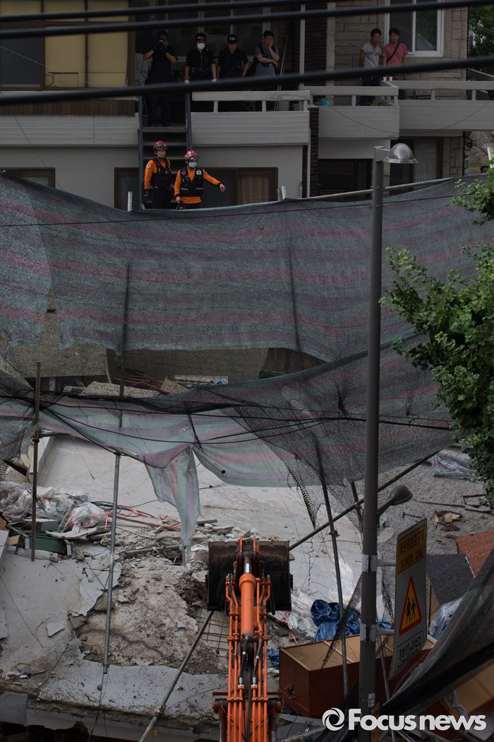 (서울=포커스뉴스) 18일 오후 서울 서대문구 홍은동 한 공사장에서 붕괴사고가 일어나 소방대원들이 구조작업을 벌이고 있다. 소방당국은 붕괴된 건물 지하에 1명이 매몰되어 있다고 밝혔다.