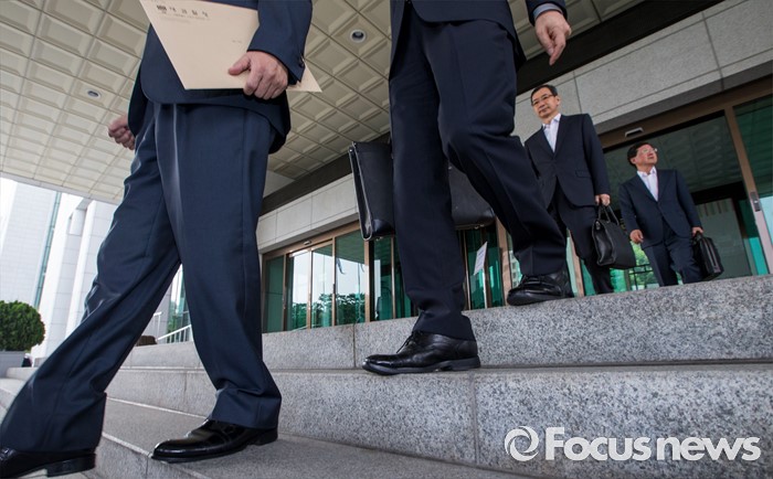 (서울=포커스뉴스) 18일 오후 서울 서초구 대검찰청에서 전국 고검장 간담회가 마친 후 박성재(맨 앞) 서울고검장을 비롯한 전국 고검장들이 청사 밖으로 발걸음을 옮기고 있다. 검찰은 이날 간담회를 통해 진경준 검사장의 뇌물수수 사건과 관련해 일선 검찰청의 의견을 수렴하고 대책을 논의하기로 밝혔으나, 언론에 비공개로 진행했다.