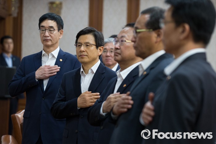(서울=포커스뉴스) 황교안(왼쪽 두번째) 국무총리가 19일 오전 서울 종로구 정부서울청사에서 열린 국무회의에서 국민의례를 하고 있다.