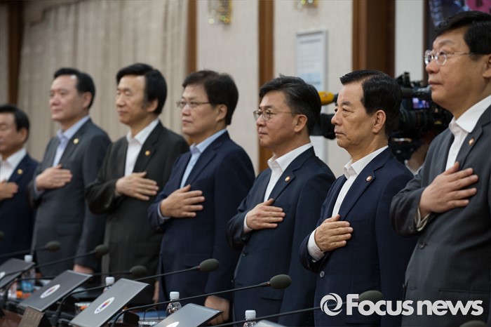 (서울=포커스뉴스) 19일 오전 서울 종로구 정부서울청사에서 열린 국무회의에 참석한 국무위원들이 국민의례를 하고 있다.