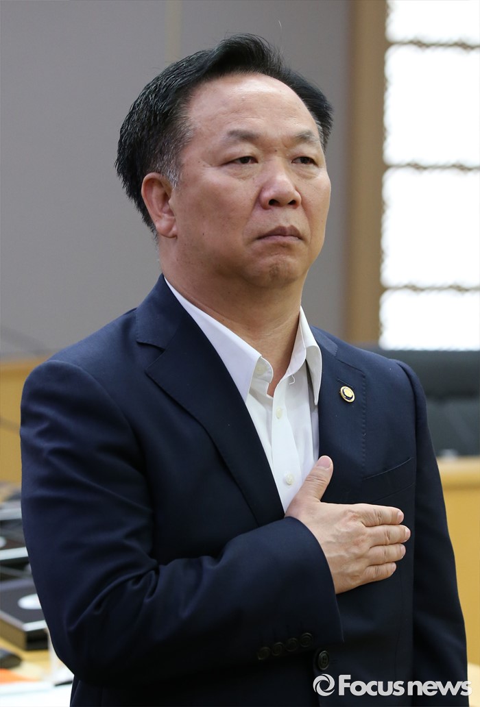 (세종=포커스뉴스) 김동극 인사혁신처장이 19일 오전 세종시 정부세종청사 국무회의장에서 서울-세종 간 영상회의로 열린 국무회의에 참석해 국기엥 대한 경례를 하고 있다.