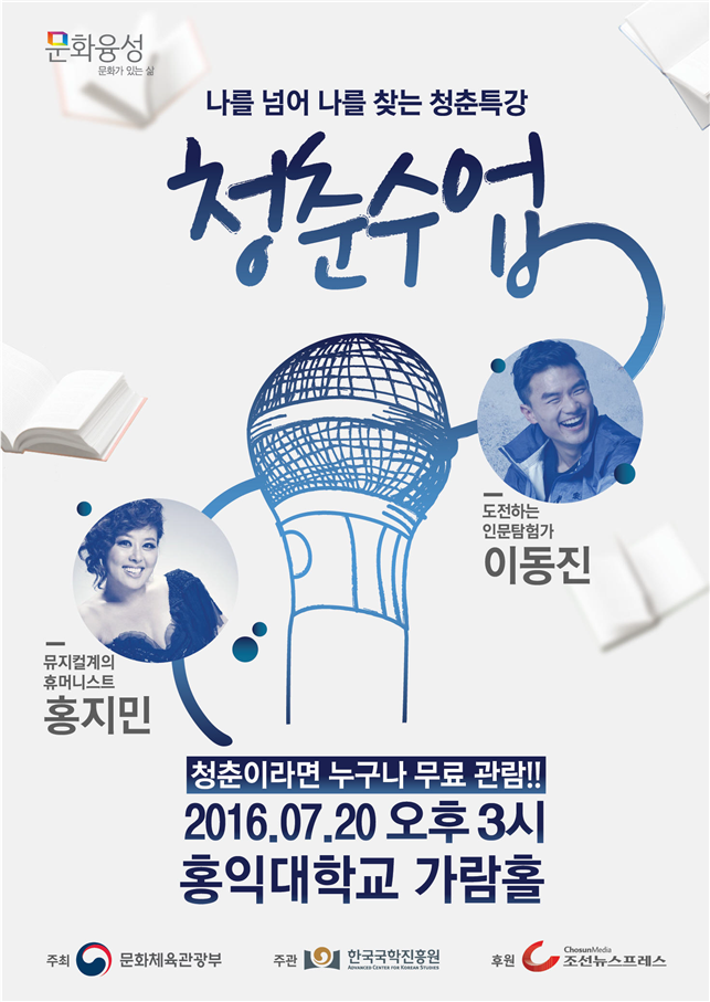 청춘수업은 초청인사 강연을 비롯해 강연자와의 대화, 작은 공연 등으로 구성된다. 이번 수업에는 청년 모험가 이동진 씨와 뮤지컬계의 디바 홍지민이 연사로 출연한다. 홍지민은 강연과 함께 작은 공연도 진행할 예정이다.'청춘수업' 포스터.<사진제공=문화체육관광부>
