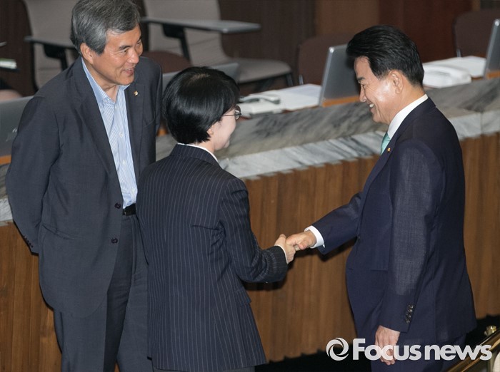 (서울=포커스뉴스) 19일 오전 서울 여의도 국회에서 열린 344회 국회(임시회) 1차 본회의, 사드(THAAD·고고도미사일방어체계) 배치에 대한 긴급현안질문에 참석한 박선숙(가운데), 정동영(오른쪽) 국민의당 의원이 인사하고 있다.
