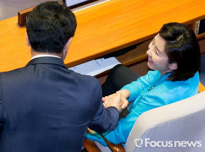 (서울=포커스뉴스) 19일 오전 서울 여의도 국회에서 열린 344회 국회(임시회) 1차 본회의, 사드(THAAD·고고도미사일방어체계) 배치에 대한 긴급현안질문에 참석한 나경원(오른쪽) 새누리당 의원과 전당대회 출마를 선언한 정병국 의원이 인사하고 있다.