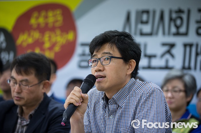 (서울=포커스뉴스) 19일 오전 서울 중구 민주노총 대회의실에서 시민 사회 공동행동 출범 및 공공부문노조 파업 돌입 선언 기자회견이 열리고 있다. 공공성 강화와 공공부문 성과·퇴출제 저지 시민사회공동 행동은 9월 27일까지 성과연봉제, 민영화 정책 중단이 없으면 공공기관 노동자 6만명이 무기한 전면 파업에 들어가겠다고 밝혔다.