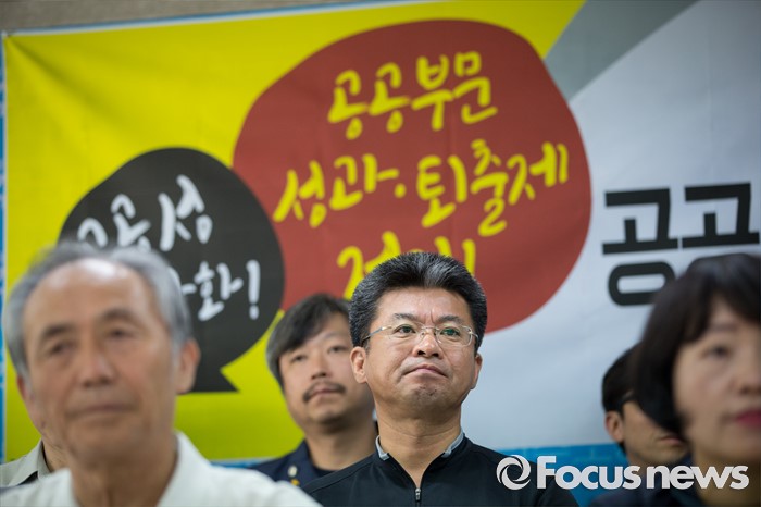 (서울=포커스뉴스) 19일 오전 서울 중구 민주노총 대회의실에서 시민 사회 공동행동 출범 및 공공부문노조 파업 돌입 선언 기자회견이 열리고 있다. 공공성 강화와 공공부문 성과·퇴출제 저지 시민사회공동 행동은 9월 27일까지 성과연봉제, 민영화 정책 중단이 없으면 공공기관 노동자 6만명이 무기한 전면 파업에 들어가겠다고 밝혔다.