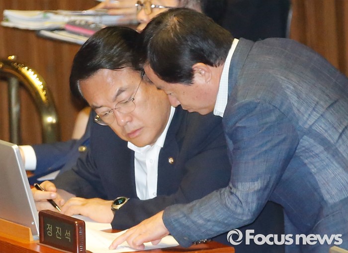 (서울=포커스뉴스) 19일 오후 서울 여의도 국회에서 열린 344회 국회(임시회) 1차 본회의, 사드(THAAD·고고도미사일방어체계) 배치에 대한 긴급현안질문에 참석한 정진석(왼쪽) 새누리당 원내대표와 주광덕 예결위 간사와 대화하고 있다.