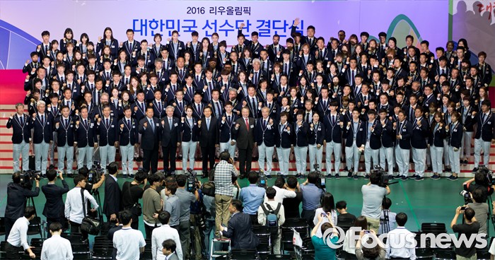 (서울=포커스뉴스) 19일 오후 서울 송파구 올림픽공원 올림픽홀에서 열린 2016 리우올림픽 대한민국 선수단 결단식에서 선수단이 기념촬영을 하고 있다.