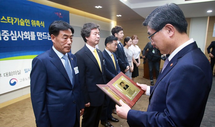 (세종=포커스뉴스) 이기권 고용노동부장관이 19일 세종시 정부세종청사 고용노동부 대회의실에서 열린 2016 스타기술인 홍보대사 위촉식에서 위촉장을 전달하고 있다. <사진제공=고용노동부>