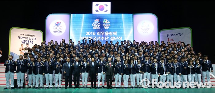 (서울=포커스뉴스) 19일 오후 서울 송파구 올림픽공원 올림픽홀에서 열린 2016 리우올림픽 대한민국 선수단 결단식에서 선수단이 기념촬영을 하고 있다.