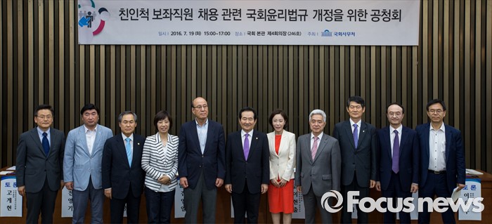 (서울=포커스뉴스) 정세균(가운데) 국회의장과 우윤근(왼쪽 세 번째) 국회 사무총장을 비롯한 토론자들이 19일 오후 서울 여의도 국회에서 열린 '친인척 보좌직원 채용 국회윤리법규 개정 위한 공청회'에 앞서 사진촬영을 하고 있다.