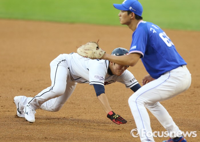 (서울=포커스뉴스) 19일 서울 잠실구장에서 열린 2016 프로야구 삼성두산 경기 3회말 1사후 우전 안타로 진루한 두산 1루주자 허경민이 삼성 투수 윤성환의 견제구에 귀루하고 있다.