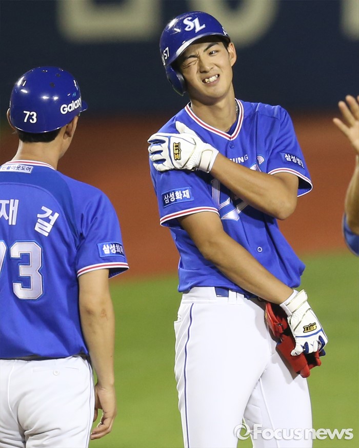 (서울=포커스뉴스) 19일 서울 잠실구장에서 열린 2016 프로야구 삼성-두산 경기 6회초 1사후 삼성 구자욱이 좌중간 3루타를 치고 3루에서 김재걸 코치와 대화하고 있다.