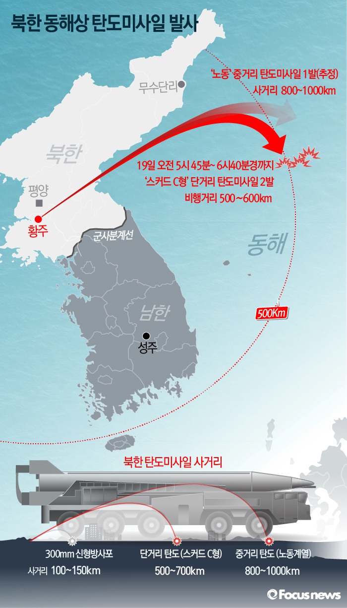 (서울=포커스뉴스) 20일 북한은 "19일 미사일 발사훈련은 미제의 핵전쟁 장비들이 투입되는 남조선작전지대 안의 항구, 비행장들을 선제타격하는 것으로 진행했다"고 밝혔다. 북한은 19일 오전 5시45분부터 6시40분까지 황해북도 황주 일대에서 동해 상으로 '스커드 C형'과 '노동' 계열로 추정 되는 탄도미사일 3발을 발사했다.
