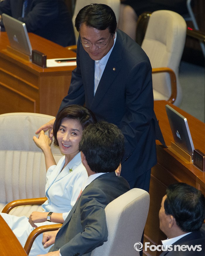 (서울=포커스뉴스) 20일 오전 서울 여의도 국회에서 열린 344회 국회(임시회) 2차 본회의, 사드(THAAD·고고도미사일방어체계) 배치에 대한 긴급현안질문에 참석한 정진석(왼쪽부터) 새누리당 원내대표, 나경원, 유승민 의원이 인사하고 있다.