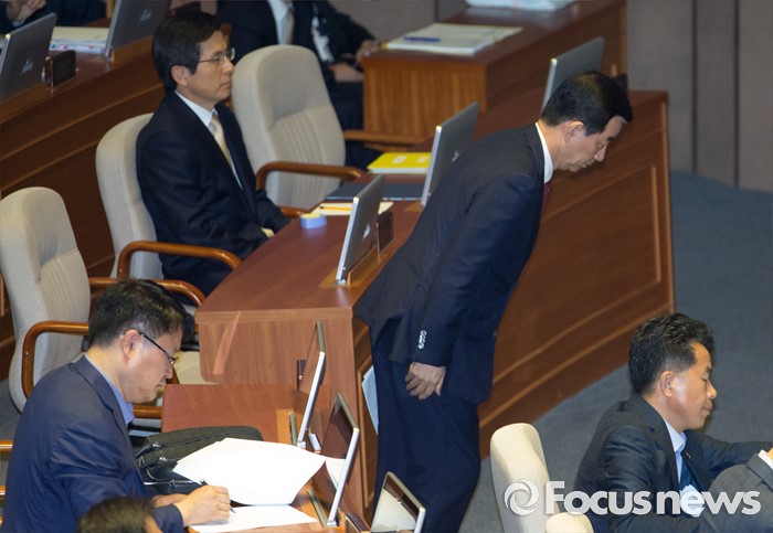 (서울=포커스뉴스) 20일 오전 서울 여의도 국회에서 열린 344회 국회(임시회) 2차 본회의, 사드(THAAD·고고도미사일방어체계) 배치에 대한 긴급현안질문에 참석한 한민구 국방부 장관이 의원들의 질문에 답하기 위해 이동하며 인사하고 있다.