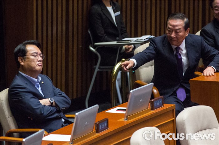 (서울=포커스뉴스) 새누리당 8.9 전당대회 불출마를 선언한 서청원(오른쪽) 의원이 20일 오전 서울 여의도 국회에서 열린 344회 국회(임시회) 2차 본회의, 사드(THAAD, 고고도미사일방어체계) 배치에 대한 긴급현안질문에 참석해 정진석 원내대표를 부르고 있다.