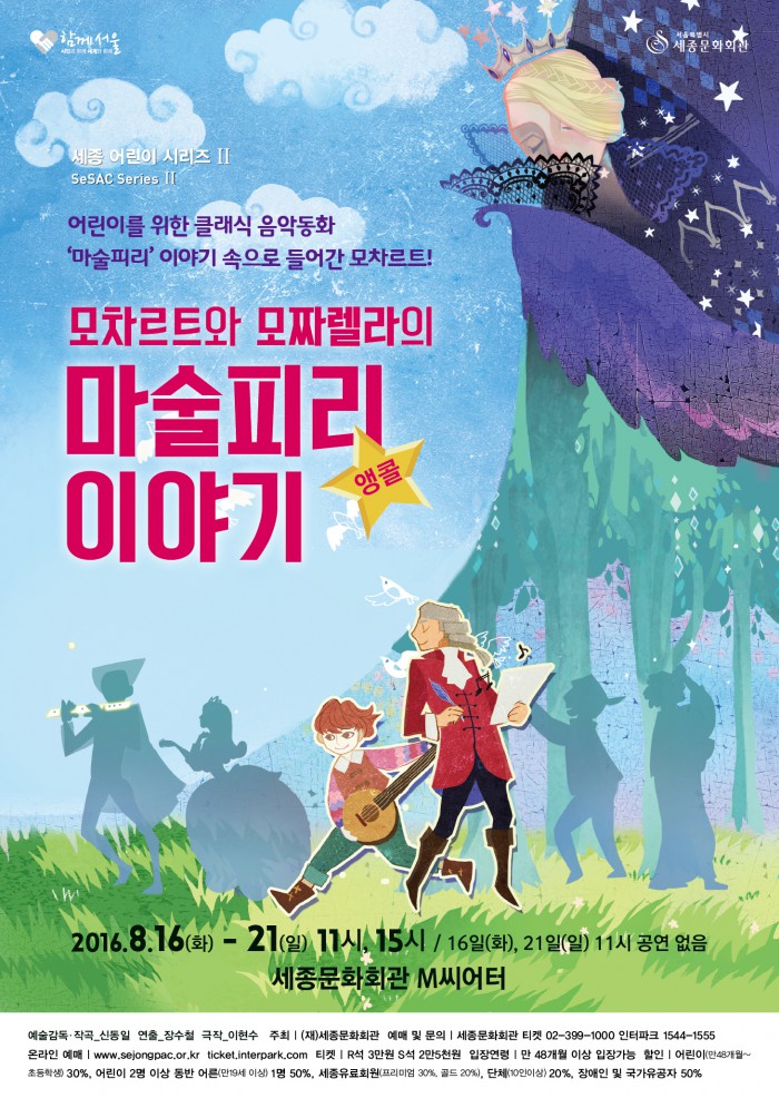 이번 공연은 서울뮤지컬페스티벌 예그린뮤지컬어워드 아동청소년 부문 음악상(2012)을 수상한 바 있는 작곡가 신동일, 어린이 음악극 '페페의 꿈', '비엔나의 음악 상자' 등에 참여한 연출가 장수철, 작가 이현수가 함께한다.가격은 R석 3만원, S석 2만5000원.'모차르트와 모짜렐라 마술피리이야기' 포스터. <사진제공=세종문화회관>