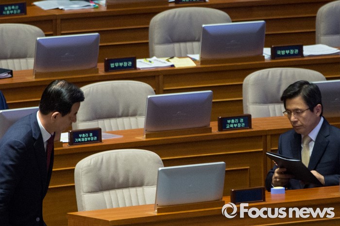 (서울=포커스뉴스) 황교안(오른쪽) 국무총리와 한민구 국방부 장관이 20일 오전 서울 여의도 국회에서 열린 344회 국회(임시회) 2차 본회의, 사드(THAAD, 고고도미사일방어체계) 배치에 대한 긴급현안질문에 참석하고 있다.