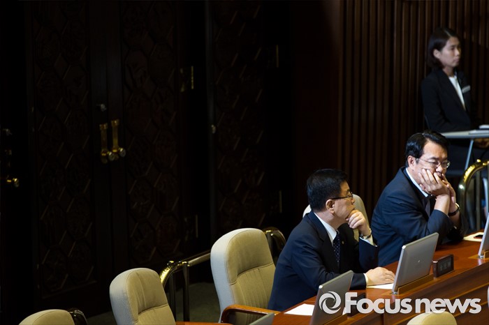 (서울=포커스뉴스) 정진석(오른쪽) 새누리당 원내대표와 김광림 정책위의장이 20일 오전 서울 여의도 국회에서 열린 344회 국회(임시회) 2차 본회의, 사드(THAAD, 고고도미사일방어체계) 배치에 대한 긴급현안질문에 참석해 생각에 잠겨 있다.