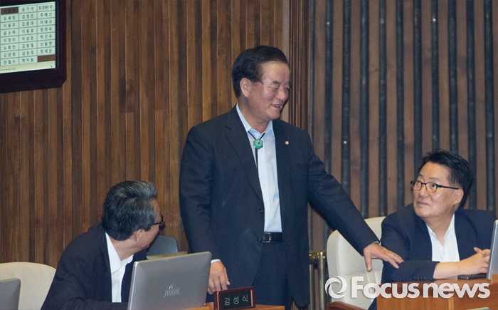 (서울=포커스뉴스) 20일 오후 서울 여의도 국회에서 열린 344회 국회(임시회) 2차 본회의, 사드(THAAD·고고도미사일방어체계) 배치에 대한 긴급현안질문에 참석한 정갑윤(가운데) 새누리당 의원과 박지원(오른쪽) 국민의당 비상대책위원장, 김성식 정책위의장이 대화하고 있다.