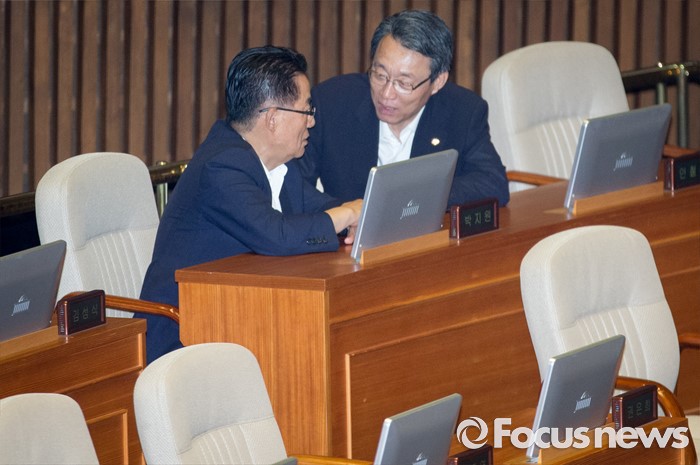 (서울=포커스뉴스) 20일 오후 서울 여의도 국회에서 열린 344회 국회(임시회) 2차 본회의, 사드(THAAD·고고도미사일방어체계) 배치에 대한 긴급현안질문에 참석한 박지원(왼쪽) 국민의당 비상대책위원장, 김성식 정책위의장이 대화하고 있다.