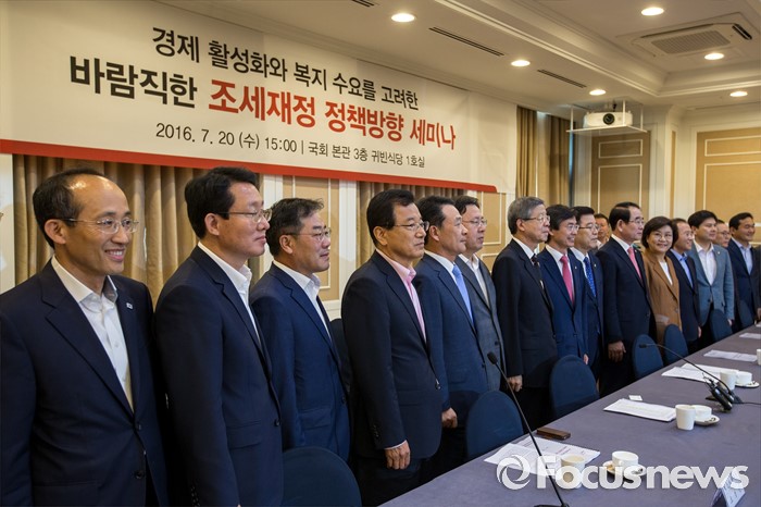 (서울=포커스뉴스) 김희옥(왼쪽 일곱 번째) 새누리당 혁신비상대책위원장을 비롯한 국회 기획재정위원회 소속 의원들이 20일 오후 서울 여의도 국회에서 열린 '조세재정 정책방향 세미나'에 앞서 사진촬영 하고 있다.