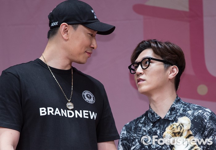 (서울=포커스뉴스) 20일 오후 서울 마포구 누리꿈스퀘어에서 열린 Mnet '서바이벌 모모랜드를 찾아서' 제작발표회에 참석한 음악프로듀서 라이머(왼쪽)와 이단옆차기가 대화를 나누고 있다.