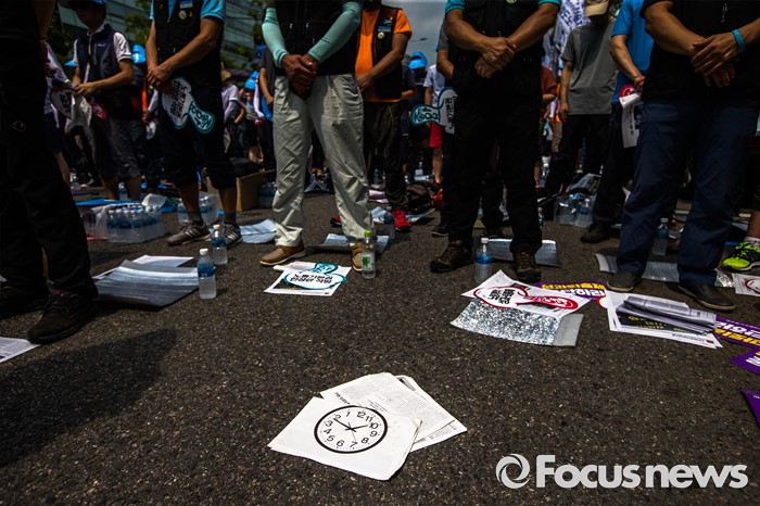 (서울=포커스뉴스) 20일 오후 서울 여의도 산업은행 앞에서 '민주노총 총파업 총력투쟁' 결의대회가 열리고 있다. 이번 결의대회에서 민노총 조합원들은 한상균 민노총 위원장 실형선고, 성과연봉제 등을 규탄했다.