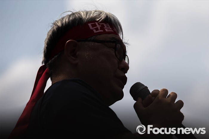 (서울=포커스뉴스) 20일 오후 서울 여의도 산업은행 앞에서 '민주노총 총파업 총력투쟁' 결의대회가 열리고 있다. 이번 결의대회에서 민노총 조합원들은 한상균 민노총 위원장 실형선고, 성과연봉제 등을 규탄했다.