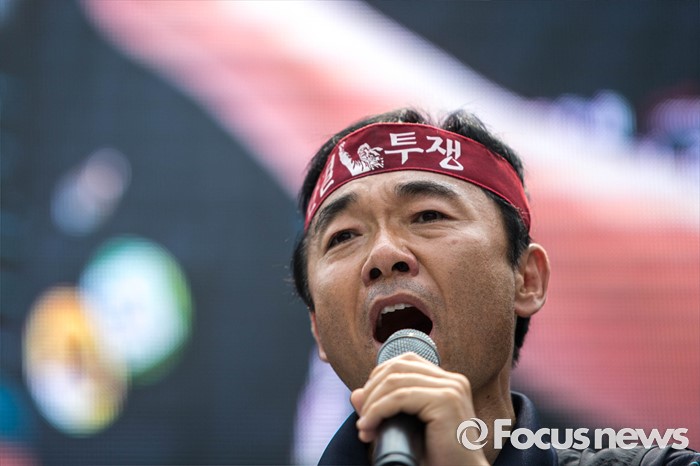 (서울=포커스뉴스) 20일 오후 서울 여의도 산업은행 앞에서 '민주노총 총파업 총력투쟁' 결의대회가 열리고 있다. 이번 결의대회에서 민노총 조합원들은 한상균 민노총 위원장 실형선고, 성과연봉제 등을 규탄했다.