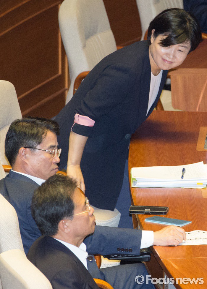 (서울=포커스뉴스) 20일 오후 서울 여의도 국회에서 열린 344회 국회(임시회) 2차 본회의, 사드(THAAD·고고도미사일방어체계) 배치에 대한 긴급현안질문에 서영교 무소속 의원이 참석해 동료 의원들과 인사하고 있다. 서 의원은 가족채용 논란 등으로 더불어민주당을 탈당했다.