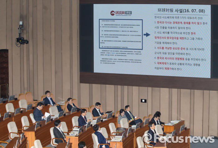 (서울=포커스뉴스) 20일 오후 서울 여의도 국회에서 열린 344회 국회(임시회) 2차 본회의, 사드(THAAD·고고도미사일방어체계) 배치에 대한 긴급현안질문에 참석한 김영호 더불어민주당 의원이 윤병세 외교부 장관에게 중국 언론 반응과 관련 자료를 보여주며 질문하고 있다.