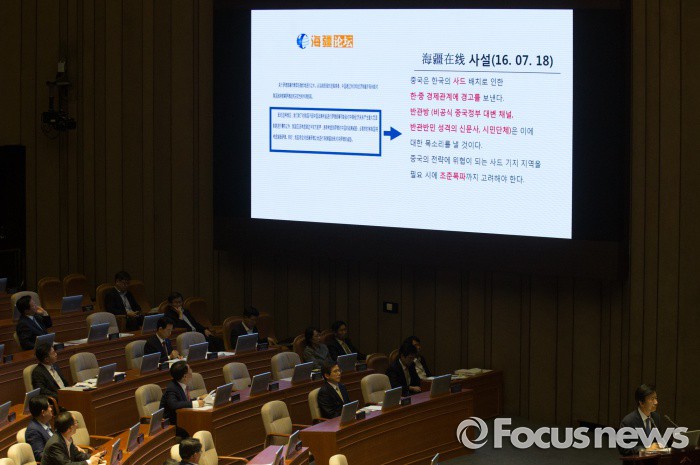 (서울=포커스뉴스) 20일 오후 서울 여의도 국회에서 열린 344회 국회(임시회) 2차 본회의, 사드(THAAD·고고도미사일방어체계) 배치에 대한 긴급현안질문에 참석한 김영호 더불어민주당 의원이 윤병세 외교부 장관에게 중국 언론 반응과 관련 자료를 보여주며 질문하고 있다.
