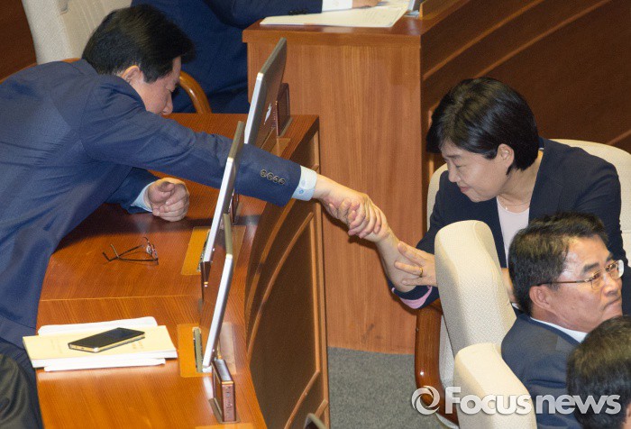 (서울=포커스뉴스) 20일 오후 서울 여의도 국회에서 열린 344회 국회(임시회) 2차 본회의, 사드(THAAD·고고도미사일방어체계) 배치에 대한 긴급현안질문에 서영교 무소속 의원이 참석해 동료 의원들과 인사하고 있다. 서 의원은 가족채용 논란 등으로 더불어민주당을 탈당했다.