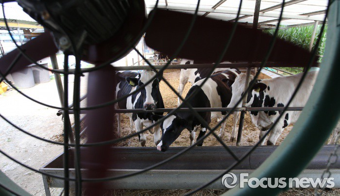 (세종=포커스뉴스) 폭염주의보가 발령된 20일 오후 세종시 한 농장에서 젖소들이 대형 선풍기 바람에 더위를 식히고 있다.
