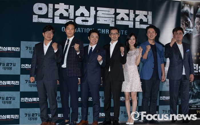 (서울=포커스뉴스) 20일 오후 서울 성동구 왕십리 CGV에서 열린 영화 '인천상륙작전' 언론시사회에 참석한 배우 박철민(왼쪽부터), 이정재, 이범수, 이재한 감독, 진세연, 정준호, 정태원 대표가 포토타임을 갖고 있다.