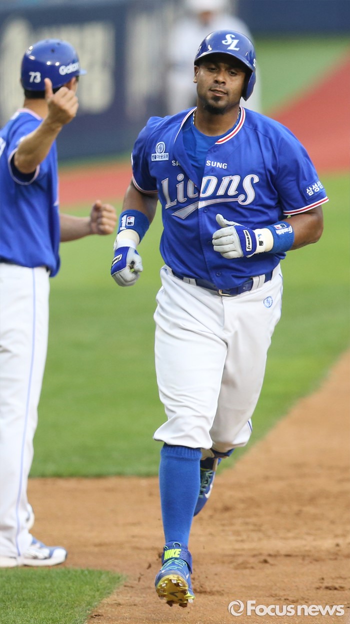 (서울=포커스뉴스) 20일 서울 잠실구장에서 열린 2016 프로야구 삼성-두산 경기 3회초 2사후 삼성 발디리스가 좌월 만루홈런을 치고 3루에서 김재걸 코치의 축하를 받으며 홈인하고 있다.