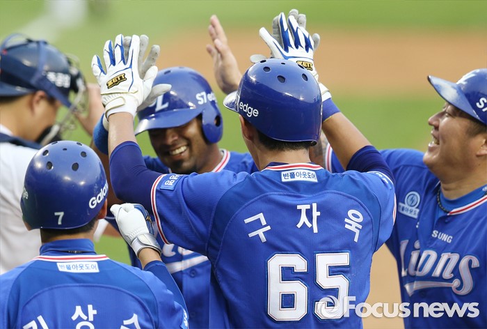 (서울=포커스뉴스) 20일 서울 잠실구장에서 열린 2016 프로야구 삼성-두산 경기 3회초 2사후 삼성 발디리스가 좌월 만루홈런을 치고 선행주자들의 환영을 받으며 홈인하고 있다.