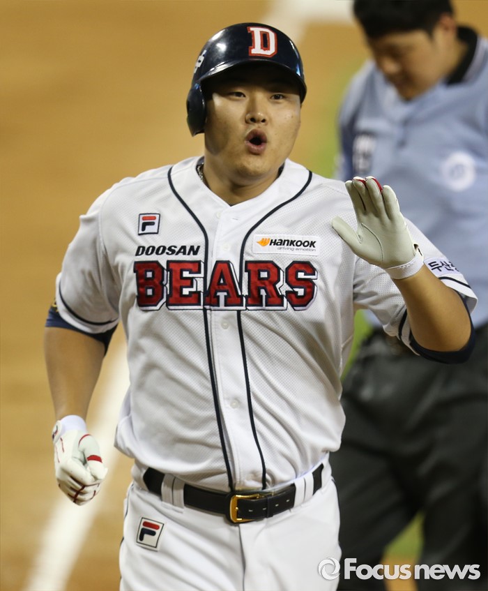 (서울=포커스뉴스) 20일 서울 잠실구장에서 열린 2016 프로야구 삼성-두산 경기 7회말 2사 1루에서 두산 대타 오재일이 우월 홈런을 치고 환호하며 홈인하고 있다.