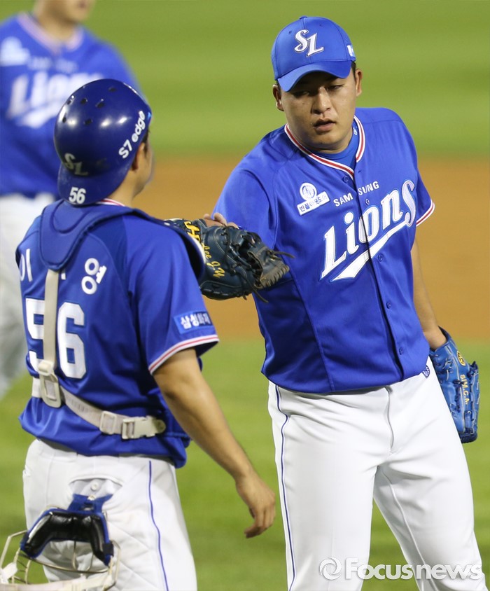 (서울=포커스뉴스) 20일 서울 잠실구장에서 열린 2016 프로야구 삼성-두산 경기에서 구자욱과 발디리스의 홈런 두 방으로 두산을 물리친 삼성의 마무리 투수 심창민과 포수 이지영이 경기를 마치고 승리의 기쁨을 나누고 있다.