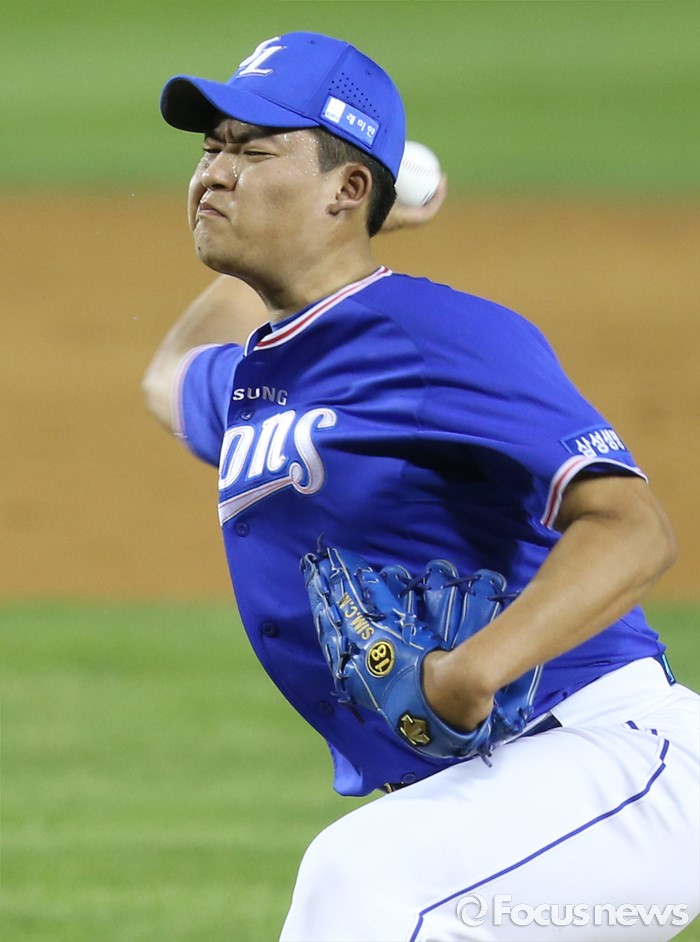 (서울=포커스뉴스) 20일 서울 잠실구장에서 열린 2016 프로야구 삼성-두산 경기에서 삼성 마무리 투수 심창민이 9회말에 등판해 전력투구하고 있다.