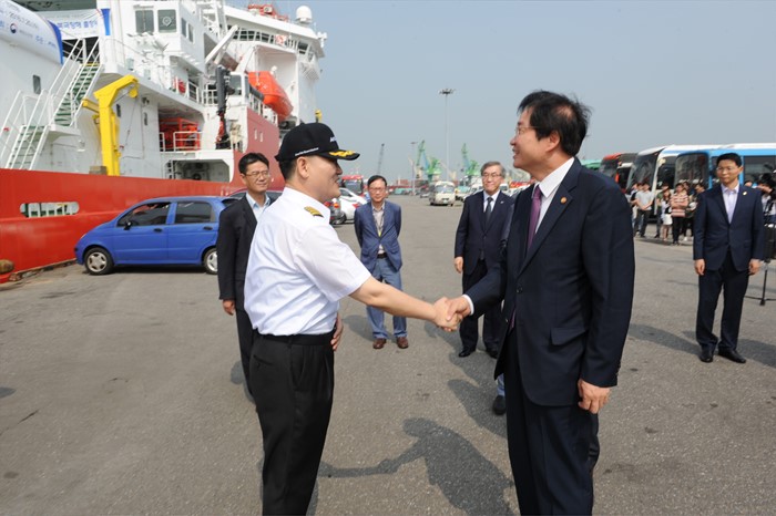 (인천=포커스뉴스) 김영석 해양수산부 장관이 20일 인천항 내항에서 열린 아라온호 북극항해 출항식에서 승조원들과 악수를 하며 격려하고 있다. <사진제공=해양수산부>