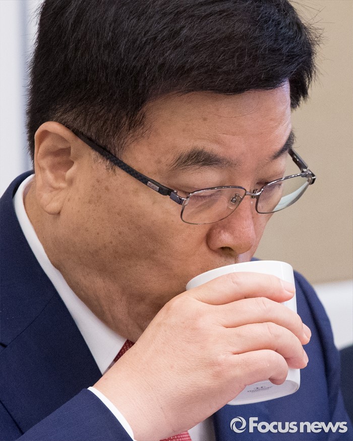 (서울=포커스뉴스) 21일 오전 서울 여의도 국회 귀빈식당에서 열린 2016년 세법개정 당정협의에 참석한 김광림 새누리당 정책위의장이 물을 마시고 있다.