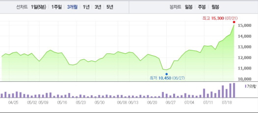 NEW는 21일 오전 9시23분 현재 전 거래일 대비 6.01%(850원) 상승한 1만5000원에 거래되고 있다.