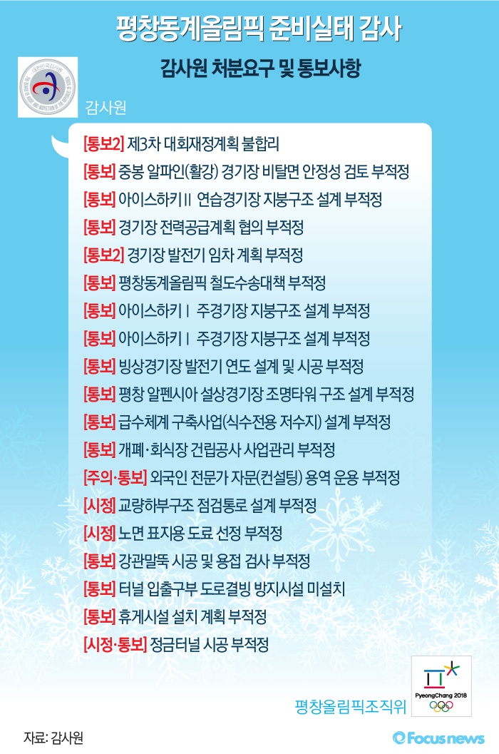 (서울=포커스뉴스) 감사원은 20일 평창동계올림픽 조직위원회를 비롯해 대회와 관련한 총 10개 기관을 대상으로 지난 3월28일부터 4월22일까지 19일간 대회 준비상황을 점검했다. 감사 결과에 따르면 총 19개 항목이 부적정 판정을 받아 감사원으로부터 통보, 시정, 주의 등을 받은 것으로 나타났다.