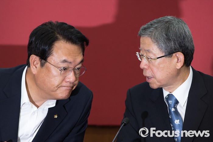 (서울=포커스뉴스) 김희옥(오른쪽) 새누리당 혁신비상대책위원장과 정진석원내대표가 21일 오전 서울 여의도 새누리당사에서 열린 혁신비상대책위원회의에 참석해 대화 하고 있다.