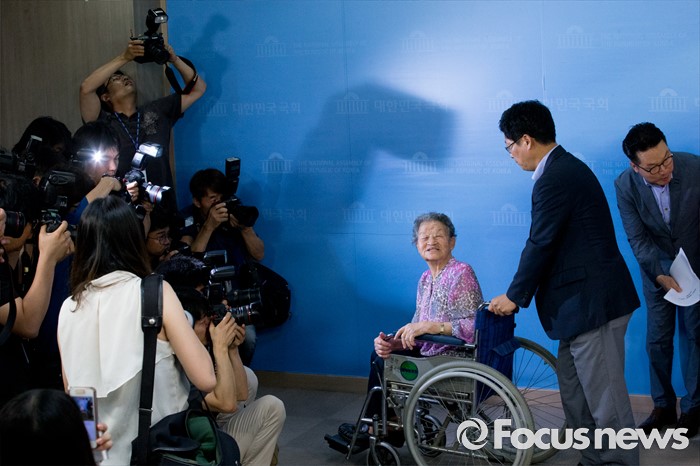 (서울=포커스뉴스) 21일 오전 서울 여의도 국회 정론관에서 유은혜 더불어민주당 의원, 최성 고양시장, 이용수, 박옥선, 이옥선 할머니 등이 위안부 특별법 입법 청원 기자회견을 마친 뒤 퇴장하고 있다.