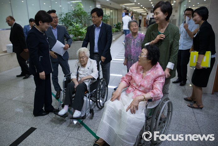 (서울=포커스뉴스) 21일 오전 서울 여의도 국회 정론관 앞에서 위안부 특별법 입법 청원 기자회견에 나서는 유은혜 더불어민주당 의원, 최성 고양시장, 이용수, 박옥선, 이옥선 할머니 등과 강은희 여성가족부 장관이 대화하고 있다.